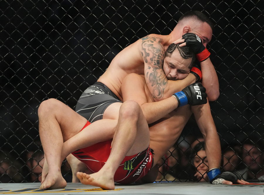 Mar 5, 2022; Las Vegas, Nevada, UNITED STATES; Colby Covington (red gloves) fights Jorge Masvidal (blue gloves) during UFC 272 at T-Mobile Arena. Mandatory Credit: Stephen R. Sylvanie-USA TODAY Sports