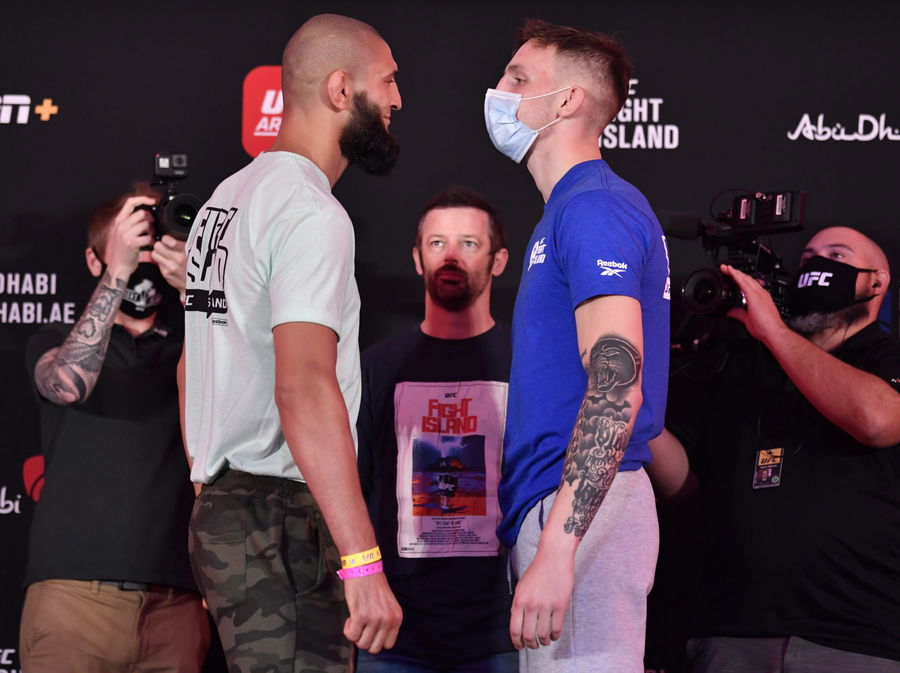 ABU DHABI, UNITED ARAB EMIRATES – JULY 24: (L-R) Opponents Khamzat Chimaev of Czechia and Rhys McKee of Northern Ireland face off during the UFC Fight Night weigh-in inside Flash Forum on UFC Fight Island on July 24, 2020 in Yas Island, Abu Dhabi, United Arab Emirates. (Photo by Jeff Bottari/Zuffa LLC via Getty Images)