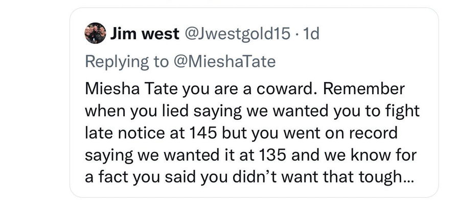 Ladd’s head coach, Jim West of MMA Gold, did not take Tate’s comments lightly and defended his fighter in a reaction tweet. West branded Tate a “coward” and accused the former UFC champion of avoiding a fight after being offered one by the team.