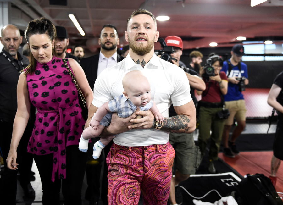 LAS VEGAS, NV – AUGUST 11: UFC lightweight champion Conor McGregor carries his son Conor McGregor Junior during a media workout at the UFC Performance Institute on August 11, 2017 in Las Vegas, Nevada. McGregor will fight Floyd Mayweather Jr. in a boxing match at T-Mobile Arena on August 26 in Las Vegas. (Photo by Brandon Magnus/Zuffa LLC/Zuffa LLC via Getty Images)
