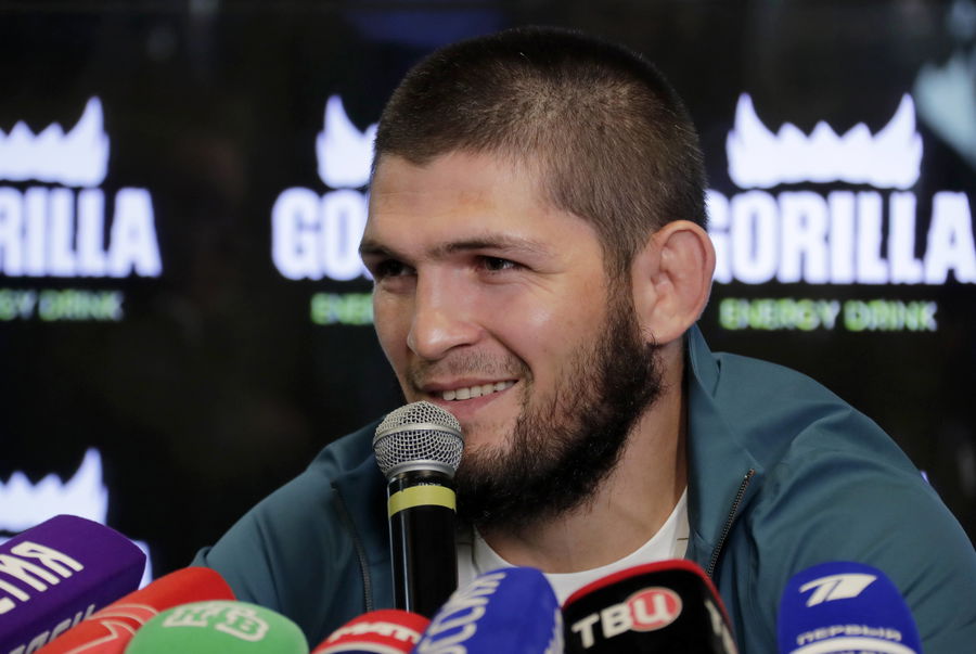 MOSCOW, RUSSIA – AUGUST 14, 2020: Mixed martial artist Khabib Nurmagomedov holding the title of UFC Lightweight Champion gives a press conference, PK, Pressekonferenz at the StandArt Hotel Moscow. Mikhail Metzel/TASS PUBLICATIONxINxGERxAUTxONLY TS0E339B