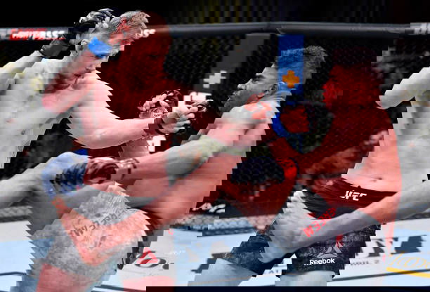 LAS VEGAS, NEVADA – FEBRUARY 06: (L-R) Alexander Volkov of Russia punches Alistair Overeem of the Netherlands in their heavyweight fight during the UFC Fight Night event at UFC APEX on February 06, 2021 in Las Vegas, Nevada. (Photo by Chris Unger/Zuffa LLC)