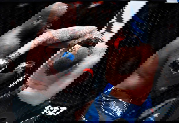 LAS VEGAS, NEVADA – DECEMBER 18: (L-R) Derrick Lewis punches Chris Daukaus in their heavyweight fight during the UFC Fight Night event at UFC APEX on December 18, 2021 in Las Vegas, Nevada. (Photo by Jeff Bottari/Zuffa LLC)
