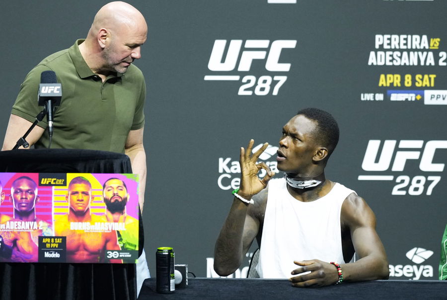 MIAMI, FLORIDA – APRIL 06: (L-R) UFC president Dana White and Israel Adesanya of Nigeria are seen on stage during the UFC 287 press conference at Miami-Dade Arena on April 06, 2023 in Miami, Florida. (Photo by Jeff Bottari/Zuffa LLC via Getty Images)