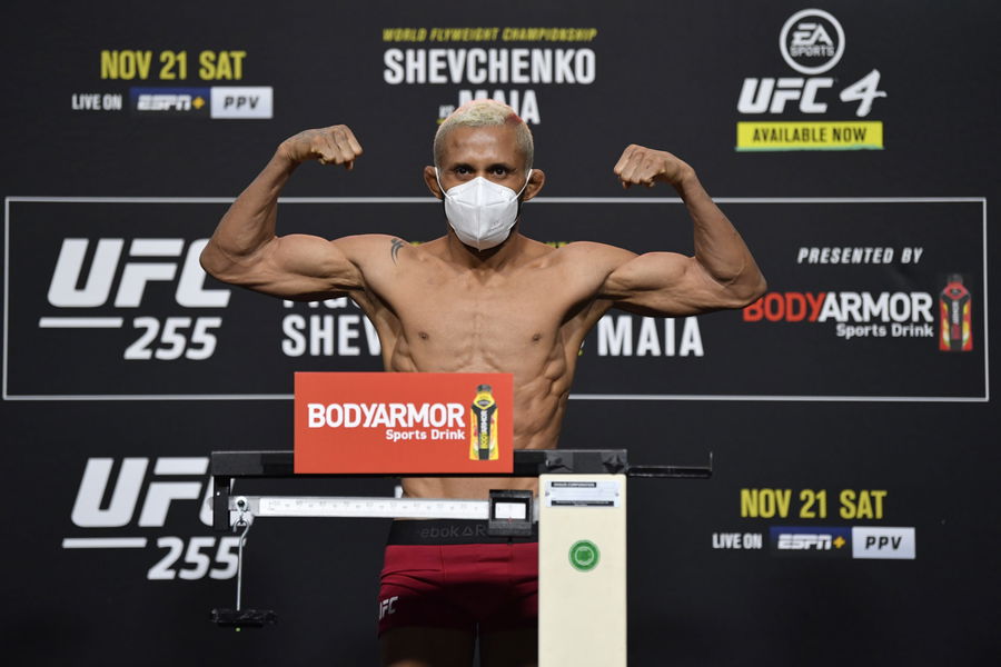 LAS VEGAS, NEVADA – NOVEMBER 20: Deiveson Figueiredo of Brazil poses on the scale during the UFC 255 weigh-in at UFC APEX on November 20, 2020, in Las Vegas, Nevada. (Photo by Jeff Bottari/Zuffa LLC)
