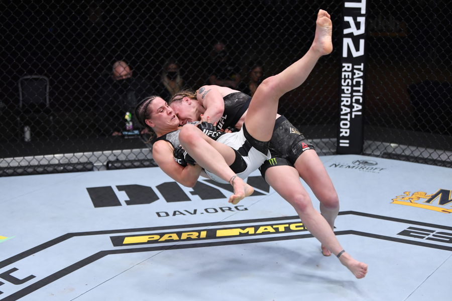 LAS VEGAS, NV – NOVEMBER 21: (R-L) Valentina Shevchenko of Kyrgyzstan takes down Jennifer Maia of Brazil in their women’s flyweight championship bout during the UFC 255 event at UFC APEX on November 21, 2020 in Las Vegas, Nevada. (Photo by Jeff Bottari/Zuffa LLC via Getty Images)