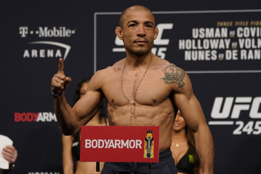 LAS VEGAS, NEVADA – DECEMBER 13: Jose Aldo of Brazil poses on the scale during the UFC 245 weigh-ins at T-Mobile Arena on December 13, 2019 in Las Vegas, Nevada. (Photo by Jeff Bottari/Zuffa LLC via Getty Images)
