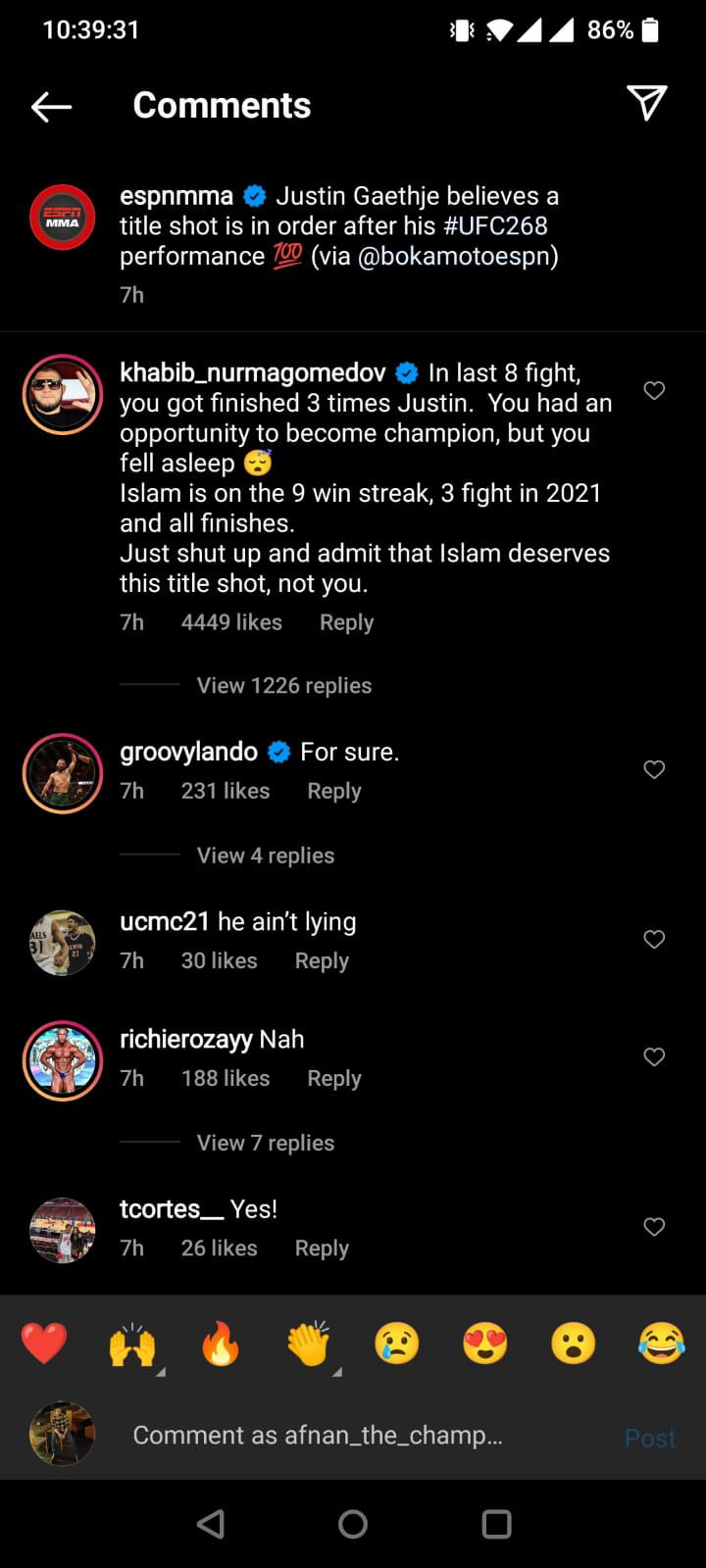“Islam is on the 9 win streak, 3 fight in 2021 and all finishes. Just shut up and admit that Islam deserves this title shot, not you.”