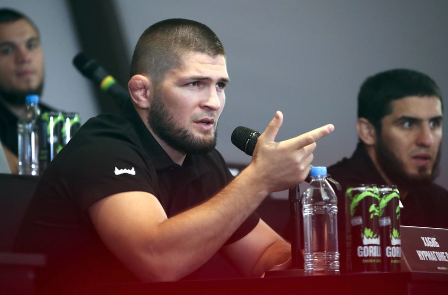 MOSCOW, RUSSIA AUGUST 18, 2021: Russian mixed martial artist and UFC lightweight champion Khabib Nurmagomedov gives a news conference. Anton Novoderezhkin/TASS PUBLICATIONxINxGERxAUTxONLY TS10CE3D