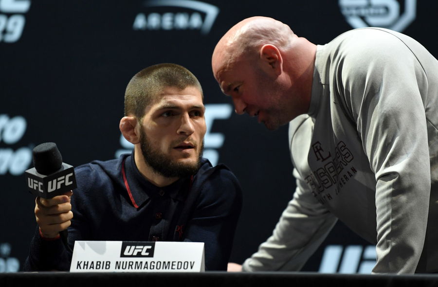 LAS VEGAS, NEVADA – OCTOBER 04: UFC lightweight champion Khabib Nurmagomedov speaks to UFC president Dana White during the UFC 229 Press Conference inside The Park Theater at Park MGM on October 4, 2018 in Las Vegas, Nevada. (Photo by Jeff Bottari/Zuffa LLC/Zuffa LLC via Getty Images)