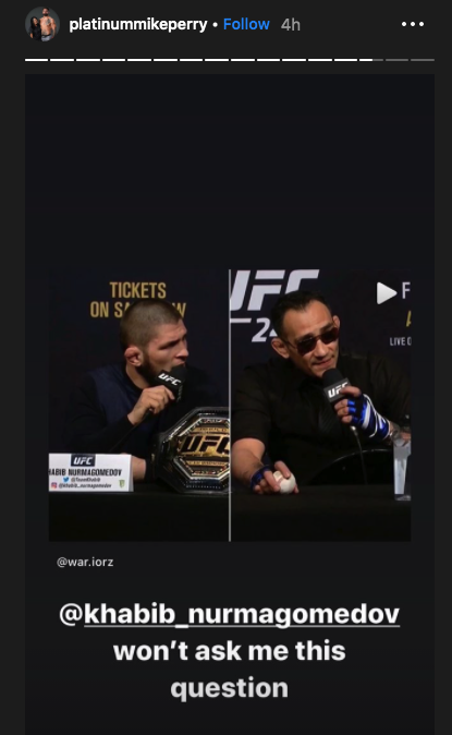 Mike Perry shared on his Instagram a video of an argument between Khabib Nurmagomedov and Tony Ferguson. This occurred at the UFC 249 press conference. The caption said, “(Khabib Nurmagomedov) won’t ask me this question”