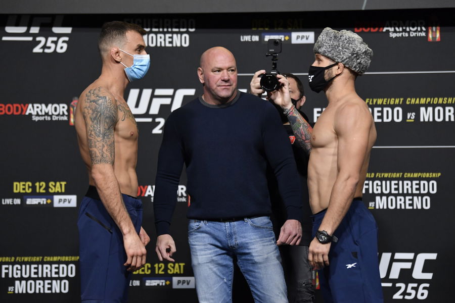 LAS VEGAS, NEVADA – DECEMBER 11: (L-R) Renato Moicano of Brazil and Rafael Fiziev of Kyrgyzstan face off during the UFC 256 weigh-in at UFC APEX on December 11, 2020 in Las Vegas, Nevada. (Photo by Jeff Bottari/Zuffa LLC via Getty Images)