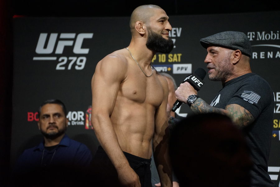 LAS VEGAS, NV – SEPTEMBER 9: Khamzat Chimaev L speaks to Joe Rogan R during the ceremonial weigh-ins on September 9, 2022, at the MGM Grand Arena in Las Vegas, NV. Photo by Amy Kaplan/Icon Sportswire MMA: SEP 09 UFC 279 Icon220909510279
