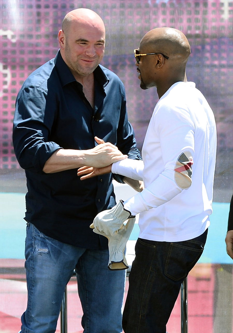 LAS VEGAS, NV – MAY 01: UFC President Dana White (L) greets WBC welterweight champion Floyd Mayweather Jr. during a groundbreaking for a USD 375 million, 20,000-seat sports and entertainment arena being built by MGM Resorts International and AEG on May 1, 2014 in Las Vegas, Nevada. The arena is scheduled to open in early 2016. (Photo by Ethan Miller/Getty Images for MGM Resorts)