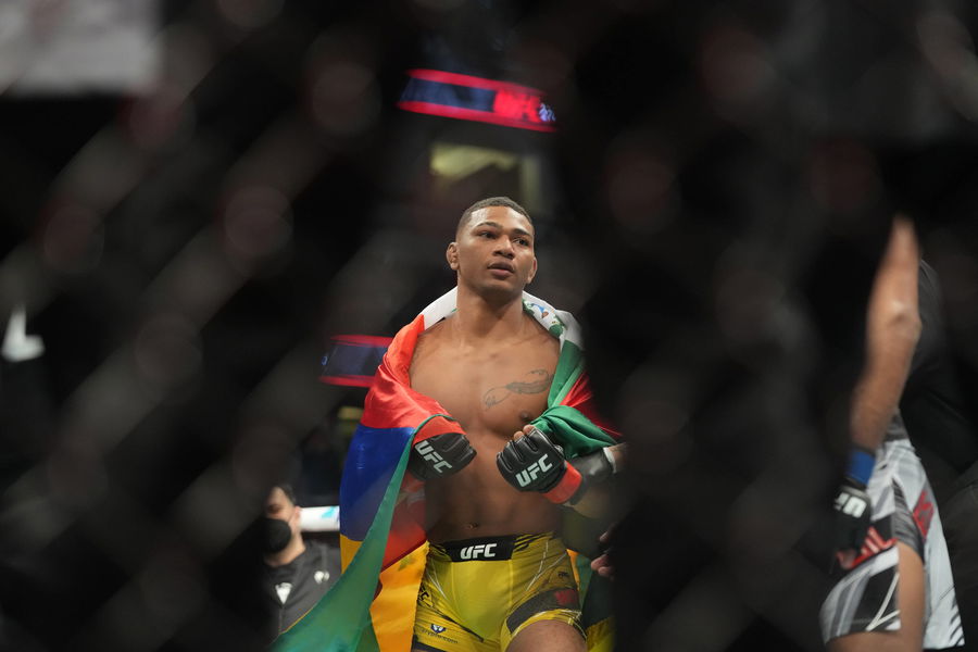 January 22, 2022, Anaheim, California, Anaheim, CA, United States: ANAHEIM, CA – JANUARY 22: Michael Morales celebrates his victory over Trevin Giles in their Welterweight fight during the UFC 270 event at Honda Center on January 22, 2022 in Anaheim, California, United States. Anaheim, California United States – ZUMAp175 20220122_zsa_p175_071 Copyright: xLouisxGrassex