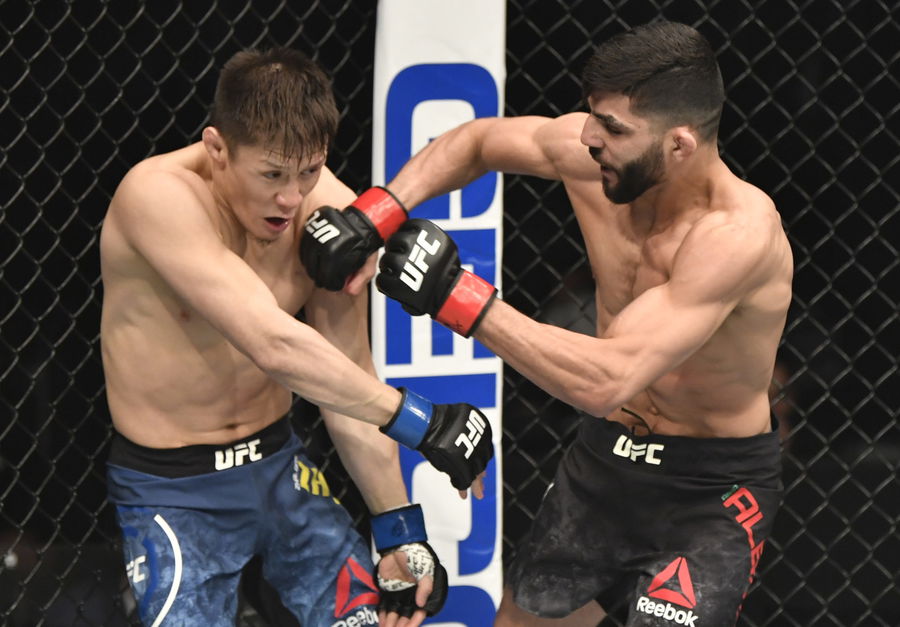 ABU DHABI, UNITED ARAB EMIRATES – JANUARY 23: (R-L) Amir Albazi of Iraq punches Zhalgas Zhumagulov of Kazakhstan in a flyweight fight during the UFC 257 event inside Etihad Arena on UFC Fight Island on January 23, 2021 in Abu Dhabi, United Arab Emirates. (Photo by Jeff Bottari/Zuffa LLC)
