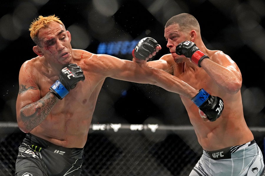 MMA: UFC 279-Diaz vs Ferguson, Sep 10, 2022 Las Vegas, Nevada, USA Nate Diaz red gloves fights Tony Ferguson blue gloves during UFC 279 at T-Mobile Arena. Mandatory Credit: Joe Camporeale-USA TODAY Sports, 10.09.2022 21:24:35, 19026586, T-Mobile Arena, NPStrans, Tony Ferguson, Nate Diaz, MMA PUBLICATIONxINxGERxSUIxAUTxONLY Copyright: xJoexCamporealex 19026586