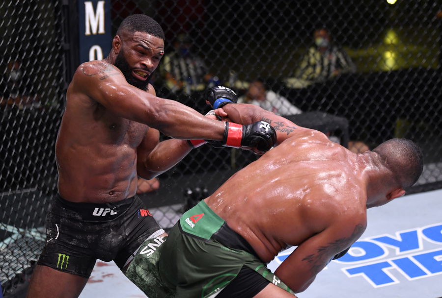 LAS VEGAS, NEVADA – MAY 30: Tyron Woodley battles Gilbert Burns in a welterweight bout during the UFC Fight Night event at UFC APEX on May 30, 2020, in Las Vegas, Nevada. (Photo by Jeff Bottari/Zuffa LLC)