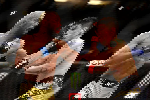 ANAHEIM, CALIFORNIA – JANUARY 22: Deiveson Figueiredo of Brazil (left) exchanges punches with Brandon Moreno of Mexico in their flyweight title fight during the UFC 270 event at Honda Center on January 22, 2022 in Anaheim, California. (Photo by Katelyn Mulcahy/Getty Images)