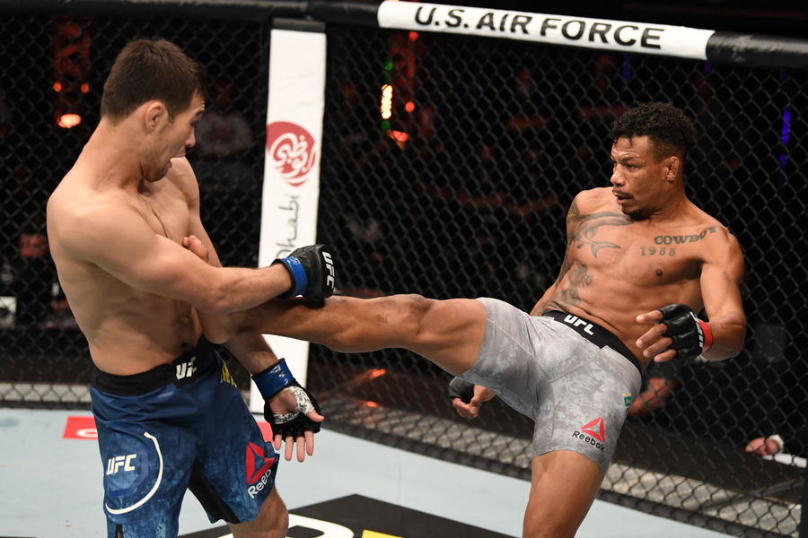 ABU DHABI, UNITED ARAB EMIRATES – OCTOBER 24: (R-L) Alex Oliveira of Brazil kicks Shavkat Rakhmonov of Kazakhstan in their welterweight bout during the UFC 254 event inside Flash Forum on UFC Fight Island on October 24, 2020 in Yas Island, Abu Dhabi, United Arab Emirates. (Photo by Josh Hedges/Zuffa LLC via Getty Images)