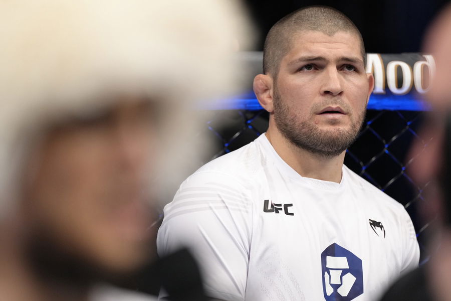 LAS VEGAS, NEVADA – MARCH 05: Khabib Nurmagomedov is seen in the corner of Umar Nurmagomedov of Russia after his victory during the UFC 272 event on March 05, 2022 in Las Vegas, Nevada. (Photo by Jeff Bottari/Zuffa LLC)
