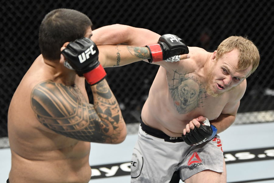 ABU DHABI, UNITED ARAB EMIRATES – JULY 19: (R-L) Serghei Spivac of Ukraine punches Carlos Felipe of Brazil in their heavyweight bout during the UFC Fight Night event inside Flash Forum on UFC Fight Island on July 19, 2020 in Yas Island, Abu Dhabi, United Arab Emirates. (Photo by Jeff Bottari/Zuffa LLC via Getty Images)