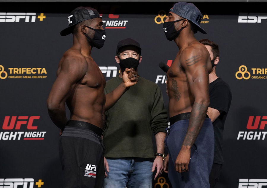 LAS VEGAS, NEVADA – DECEMBER 18: (L-R) Opponents Tafon Nchukwi of Cameroon and Jamie Pickett face off during the UFC Fight Night weigh-in at UFC APEX on December 18, 2020 in Las Vegas, Nevada. (Photo by Cooper Neill/Zuffa LLC via Getty Images)