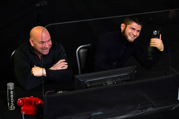 LAS VEGAS, NEVADA – MARCH 20: (L-R) UFC president Dana White and former lightweight champion Khabib Nurmagomedov look on during the UFC Fight Night event at UFC APEX on March 20, 2021 in Las Vegas, Nevada. (Photo by Chris Unger/Zuffa LLC via Getty Images)