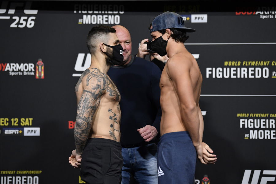 LAS VEGAS, NEVADA – DECEMBER 11: (L-R) Gavin Tucker of Canada and Billy Quarantillo face off during the UFC 256 weigh-in at UFC APEX on December 11, 2020, in Las Vegas, Nevada. (Photo by Jeff Bottari/Zuffa LLC via Getty Images)