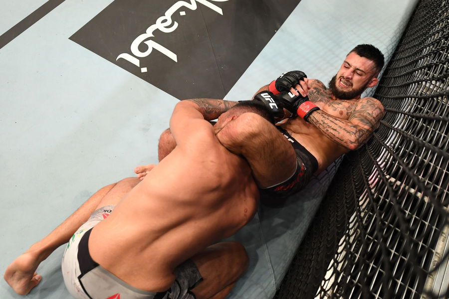 ABU DHABI, UNITED ARAB EMIRATES – OCTOBER 04: (R-L) Charles Jourdain of Canada attempts to submit Josh Culibao of Australia in their featherweight bout during the UFC Fight Night event inside Flash Forum on UFC Fight Island on October 04, 2020 in Abu Dhabi, United Arab Emirates. (Photo by Josh Hedges/Zuffa LLC)