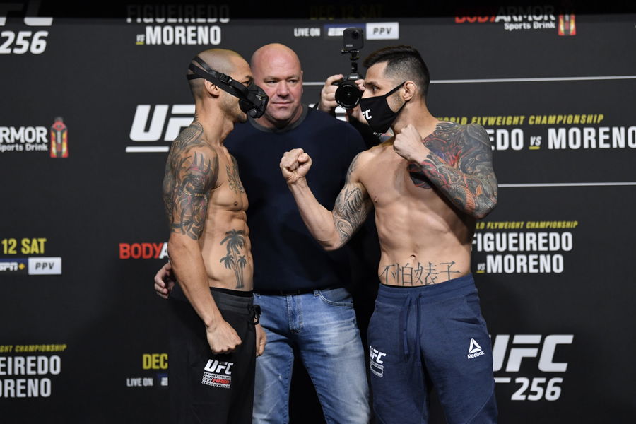 LAS VEGAS, NEVADA – DECEMBER 11: (L-R) Cub Swanson and Daniel Pineda face off during the UFC 256 weigh-in at UFC APEX on December 11, 2020 in Las Vegas, Nevada. (Photo by Jeff Bottari/Zuffa LLC via Getty Images)