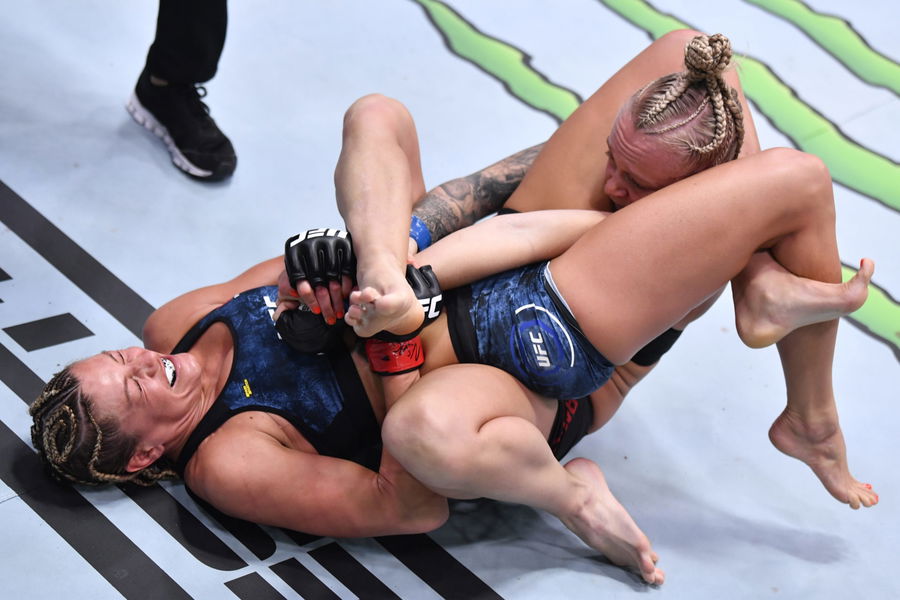 LAS VEGAS, NEVADA – NOVEMBER 14: (L-R) Ashley Yoder attempts to secure a triangle arm bar submission against Miranda Granger in a strawweight fight during the UFC Fight Night event at UFC APEX on November 14, 2020 in Las Vegas, Nevada. (Photo by Jeff Bottari/Zuffa LLC)