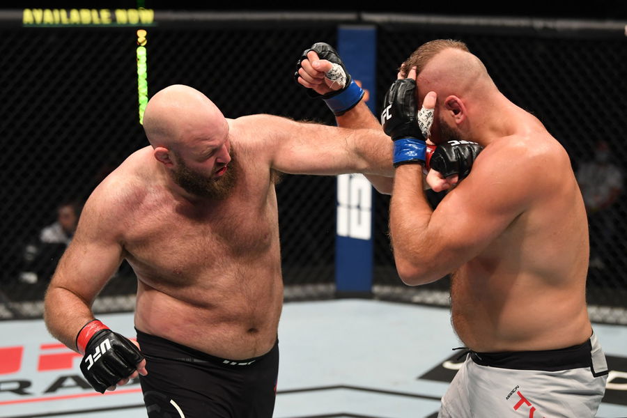 ABU DHABI, UNITED ARAB EMIRATES – OCTOBER 11: (L-R) Ben Rothwell punches Marcin Tybura of Poland in their heavyweight bout during the UFC Fight Night event inside Flash Forum on UFC Fight Island on October 11, 2020 in Abu Dhabi, United Arab Emirates. (Photo by Josh Hedges/Zuffa LLC via Getty Images)