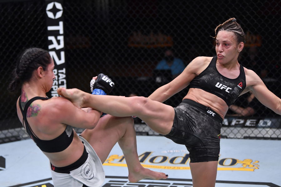 LAS VEGAS, NEVADA – NOVEMBER 21: (R-L) Antonina Shevchenko of Kyrgyzstan kicks Ariane Lipski of Brazil in their women’s flyweight bout during the UFC 255 event at UFC APEX on November 21, 2020 in Las Vegas, Nevada. (Photo by Jeff Bottari/Zuffa LLC)