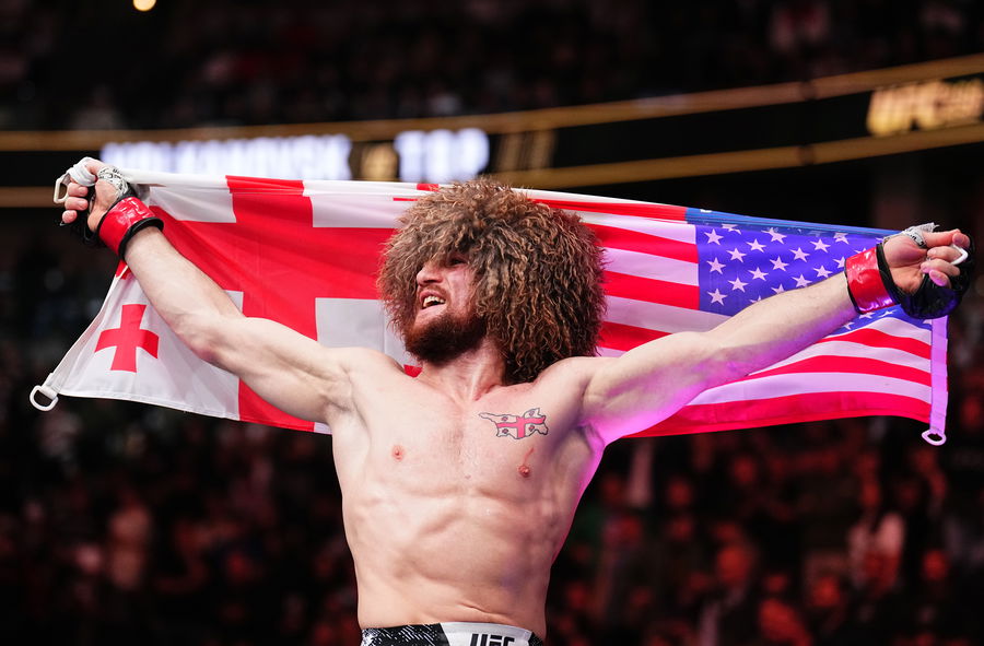 ANAHEIM, CALIFORNIA – FEBRUARY 17: Merab Dvalishvili of Georgia reacts after his victory against Henry Cejudo in a bantamweight fight during the UFC 298 event at Honda Center on February 17, 2024 in Anaheim, California. (Photo by Chris Unger/Zuffa LLC via Getty Images)