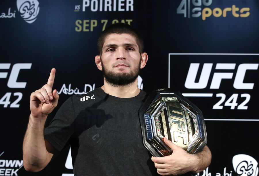 ABU DHABI, UNITED ARAB EMIRATES SEPTEMBER 7, 2019: UFC lightweight champion Khabib Nurmagomedov at a news conference after defending his title in a bout against interim UFC lightweight champion Dustin Poirier at the UFC 242 mixed martial arts tournament. Valery Sharifulin/TASS PUBLICATIONxINxGERxAUTxONLY TS0B9FDD