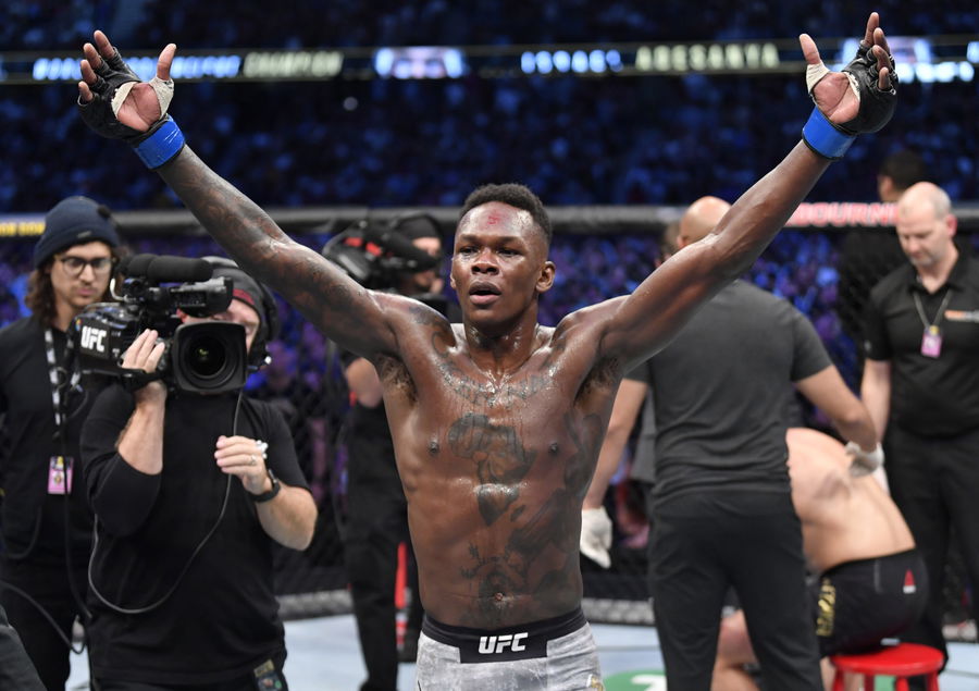 MELBOURNE, AUSTRALIA – OCTOBER 06: Israel Adesanya of Nigeria celebrates after his knockout victory over Robert Whittaker of New Zealand in their UFC middleweight championship fight during the UFC 243 event at Marvel Stadium on October 06, 2019 in Melbourne, Australia. (Photo by Jeff Bottari/Zuffa LLC/Zuffa LLC via Getty Images)