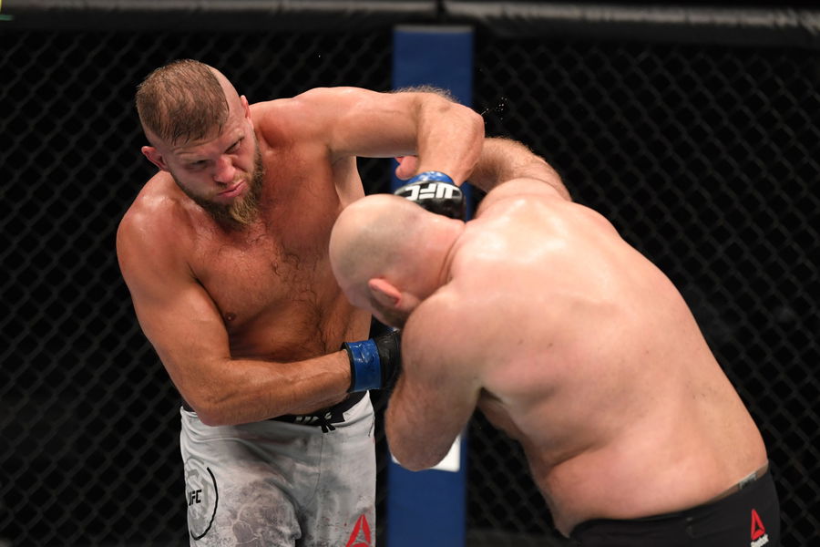 ABU DHABI, UNITED ARAB EMIRATES – OCTOBER 11: (L-R) Marcin Tybura of Poland punches Ben Rothwell in their heavyweight bout during the UFC Fight Night event inside Flash Forum on UFC Fight Island on October 11, 2020 in Abu Dhabi, United Arab Emirates. (Photo by Josh Hedges/Zuffa LLC via Getty Images)