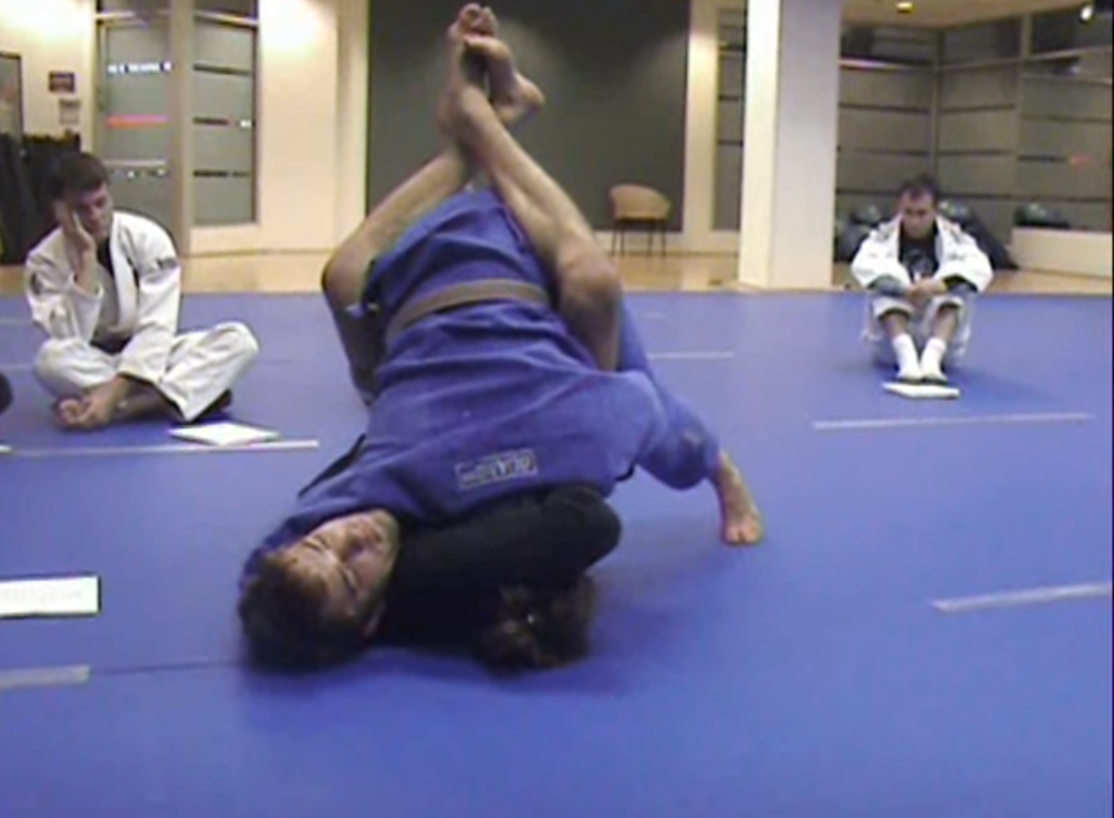 ‘So again he goes for the guillotine, I come to my toes, I grab his opposite shoulder blade, this hand grabs for his neck, I’m sorry- grabs for the arm that is around my neck, and I turn my head to then looking at his shoulder blades and I’m up on my toes and I can drop my head a little bit.”