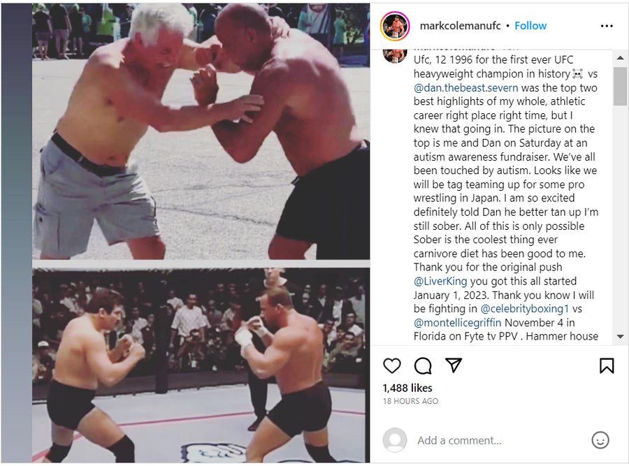 Coleman took to Instagram and posted a picture of him and Severn fighting at UFC 12. Below it was a picture of him and Severn at an autism awareness fundraiser, recreating their iconic fight. In the captions, he paid tribute to Severn. He also announced that he will team up with his former rival for a tag-team match at a pro-wrestling event in Japan.