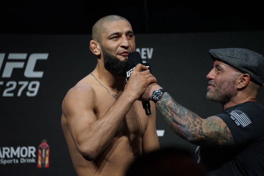 LAS VEGAS, NV – SEPTEMBER 9: Khamzat Chimaev L speaks to Joe Rogan R during the ceremonial weigh-ins on September 9, 2022, at the MGM Grand Arena in Las Vegas, NV. Photo by Amy Kaplan/Icon Sportswire MMA: SEP 09 UFC 279 Icon220909508279