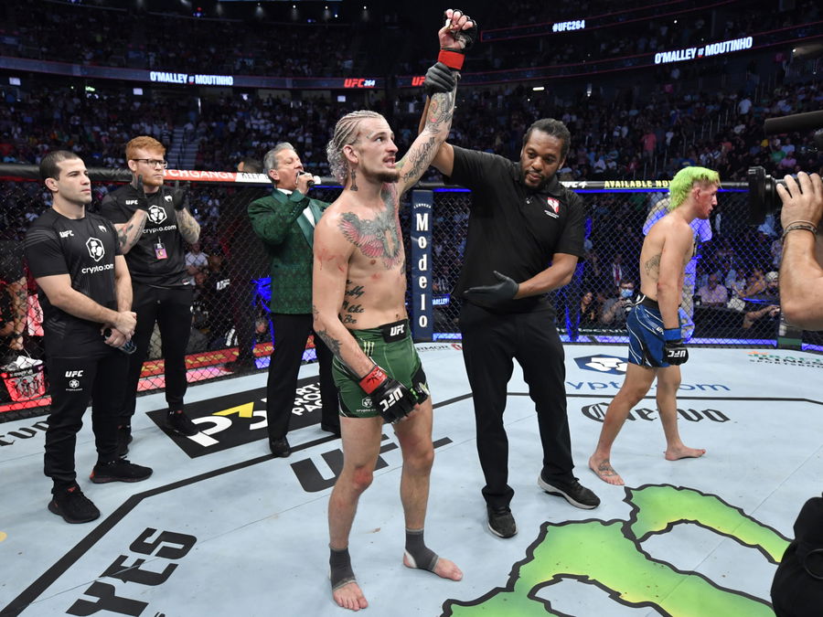 LAS VEGAS, NEVADA – JULY 10: Sean O’Malley celebrates after winning his bantamweight bout against Kris Moutinho by TKO in the third round during UFC 264: Poirier v McGregor 3 at T-Mobile Arena on July 10, 2021 in Las Vegas, Nevada. | Credit: Getty Images