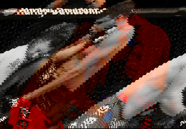 LAS VEGAS, NV – MAY 28: (R-L) Frank Mir knees Roy Nelson during their heavyweight fight at UFC 130 at the MGM Grand Garden Arena on May 28, 2011 in Las Vegas, Nevada. (Photo by Al Bello/Zuffa LLC/Zuffa LLC via Getty Images)
