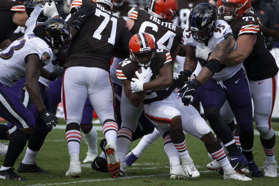 Sep 13, 2020; Baltimore, Maryland, USA; Cleveland Browns running back Nick Chubb (24) runs the ball against Baltimore Ravens defensive end Derek Wolfe (95) during the second quarter at M&T Bank Stadium. Mandatory Credit: Leah Stauffer-USA TODAY Sports