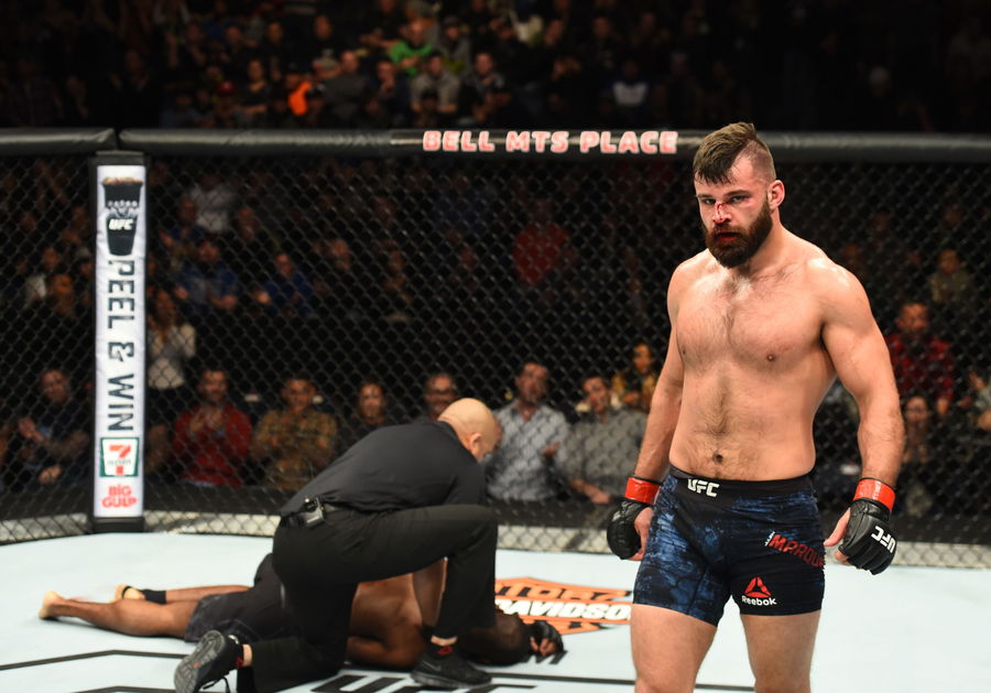 WINNIPEG, CANADA – DECEMBER 16: (R-L) Julian Marquez submits Darren Stewart of England in their middleweight bout during the UFC Fight Night event at Bell MTS Place on December 16, 2017 in Winnipeg, Manitoba, Canada. (Photo by Josh Hedges/Zuffa LLC/Zuffa LLC via Getty Images)