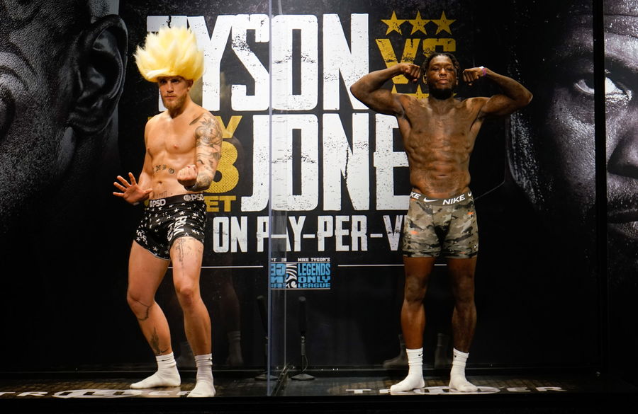 Nov 27, 2020; Los Angeles, CA, USA; Jake Paul (left) and Nate Robinson (right) weigh in for a cruiserweight boxing bout in Los Angeles. Mandatory Credit: Lynn Millspaugh/Handout Photo via USA TODAY Sports