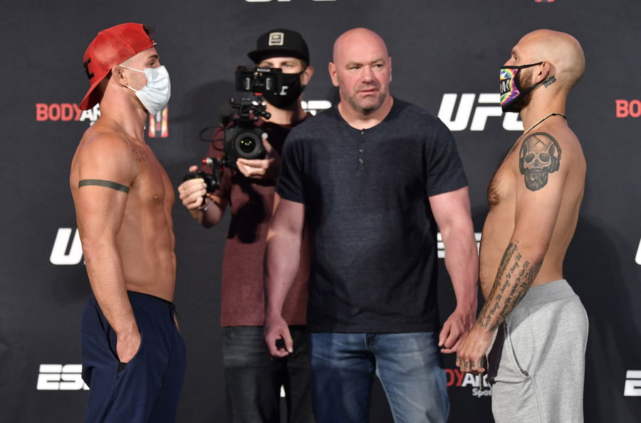 LAS VEGAS, NEVADA – JUNE 05: (L-R) Opponents Cody Stamman and Brian Kelleher face off during the UFC 250 weigh-in at UFC APEX on June 05, 2020 in Las Vegas, Nevada. (Photo by Jeff Bottari/Zuffa LLC)