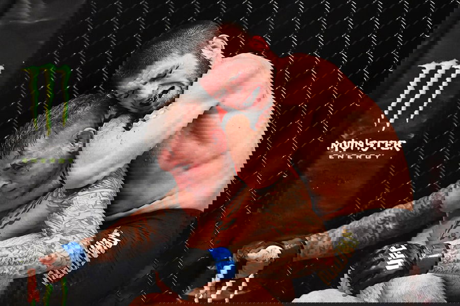Sep 7, 2019; Abu Dhabi, UAE; Khabib Nurmagomedov (red gloves) fights Dustin Poirier (blue gloves) during UFC 242 at The Arena. Mandatory Credit: Per Haljestam-USA TODAY Sports
