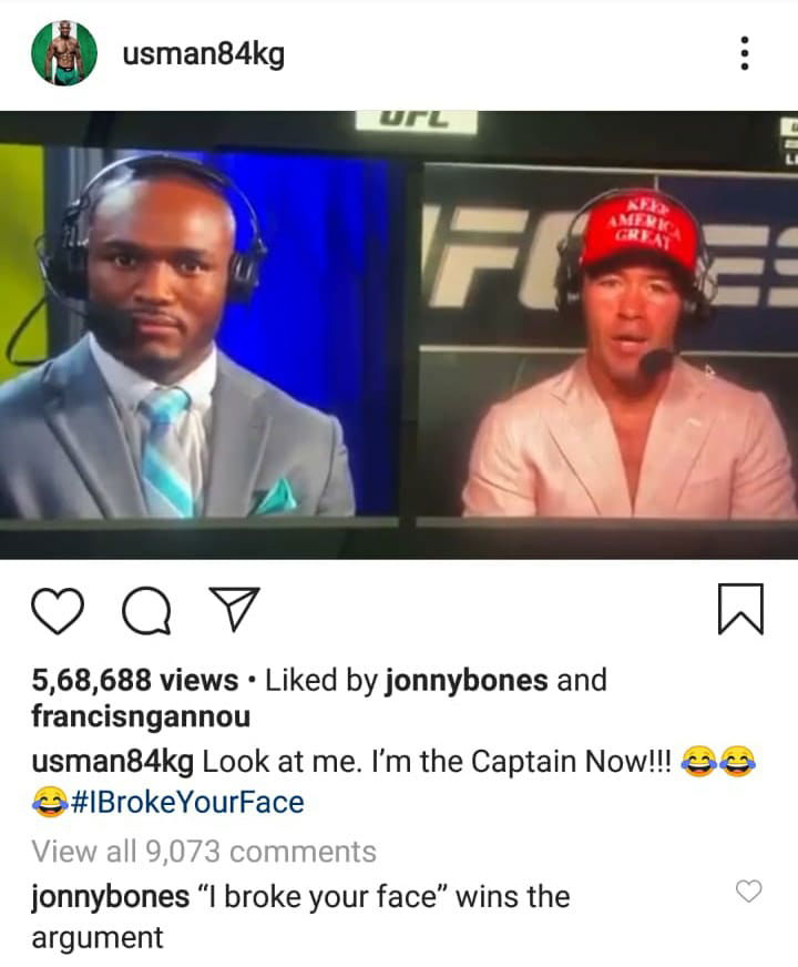 Kamaru Usman was quite amused by his interaction with Colby post-fight and took to Twitter to react to the altercation. Furthermore, Jon Jones chimed in on the action and went after his former roommate in Colby.