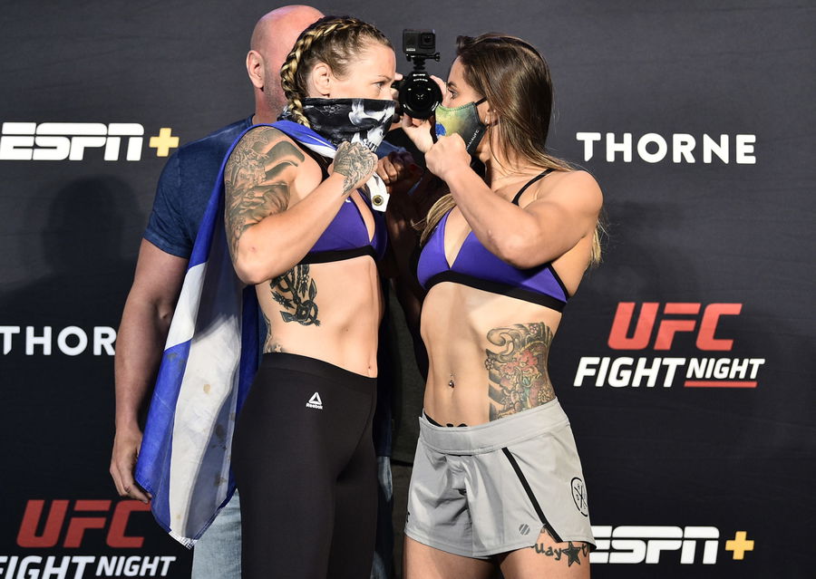 LAS VEGAS, NEVADA – JULY 31: (L-R) Opponents Joanne Calderwood of Scotland and Jennifer Maia of Brazil face off during the UFC Fight Night weigh-in at UFC APEX on July 31, 2020 in Las Vegas, Nevada. (Photo by Chris Unger/Zuffa LLC via Getty Images)